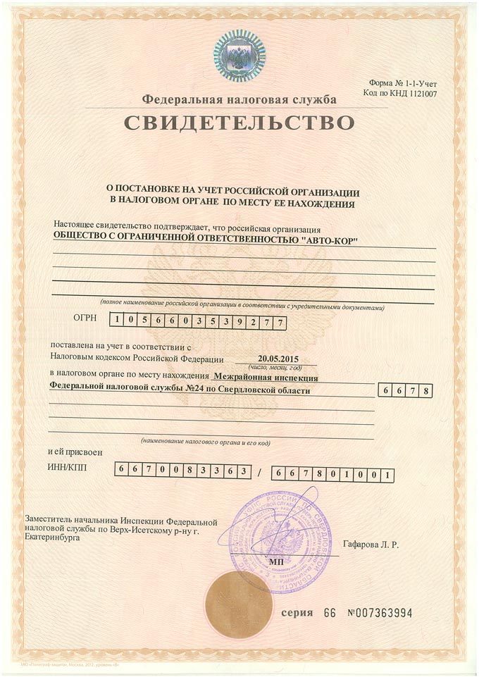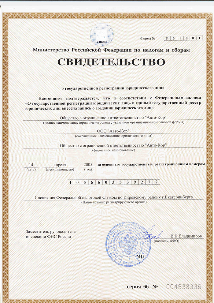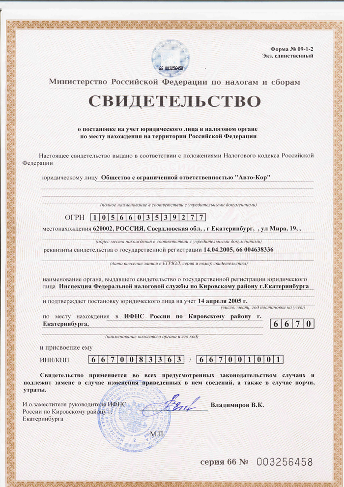 14 апреля 2005 года ООО «Авто-Кор» поставлено на учет в налоговом органе по месту своего нахождения на территории Российской Федерации по адресу 620002, Россия, Свердловская область, г. Екатеринбург, ул. Мира, д. 19. ИФНС России по Кировскому району г. Екатеринбурга предприятию присвоен ИНН 6670083363 и КПП 667001001. Посмотреть документ