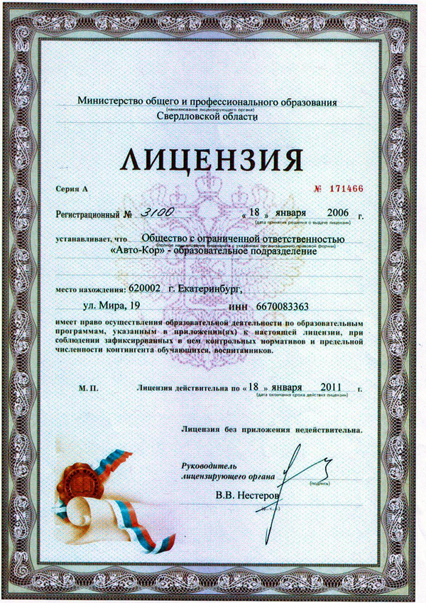 1. Лицензия на право осуществления образовательной деятельности серии А № 171466, регистрационный номер 3100, выдана Министерством общего и профессионального образования Свердловской области 18.01.2006 года, действительна по 18.01.2011 года. Посмотреть документ