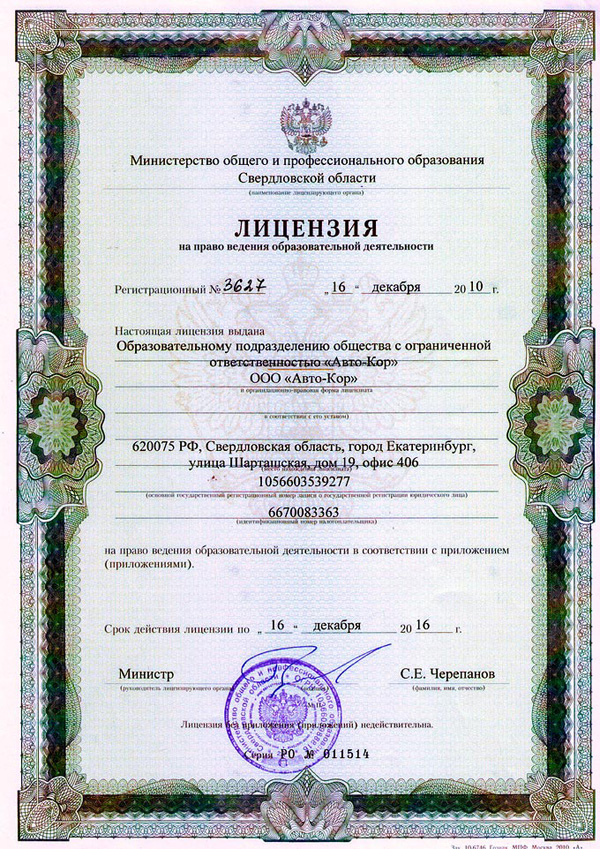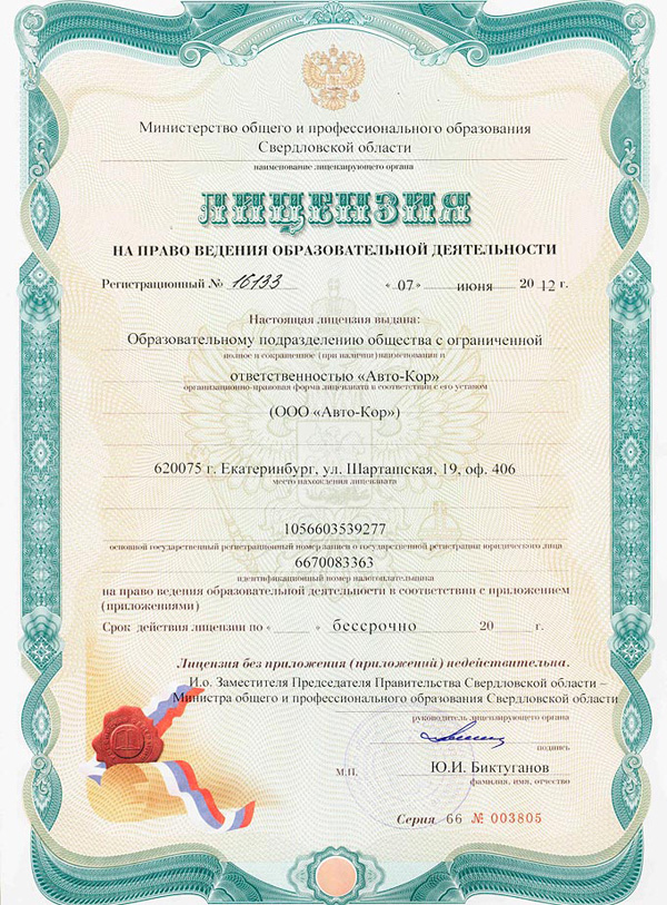4. Лицензия на осуществление образовательной деятельности серии 66Л01 № 0004116, регистрационный номер 16133, выдана Министерством общего и профессионального образования Свердловской области, действительна бессрочно (посмотреть документ).