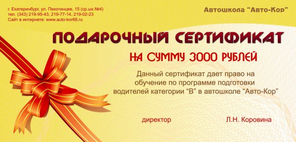 "Подарочный сертификат" от автошколы "Авто-Кор" - красивый и элегантный подарок. Вы можете подарить его как членам семьи, так и коллегам по работе, деловым партнёрам по бизнесу, любимому человеку, отметить своих лучших сотрудников, наградив их подарочным сертификатом на право обучения в автошколе "Авто-Кор"